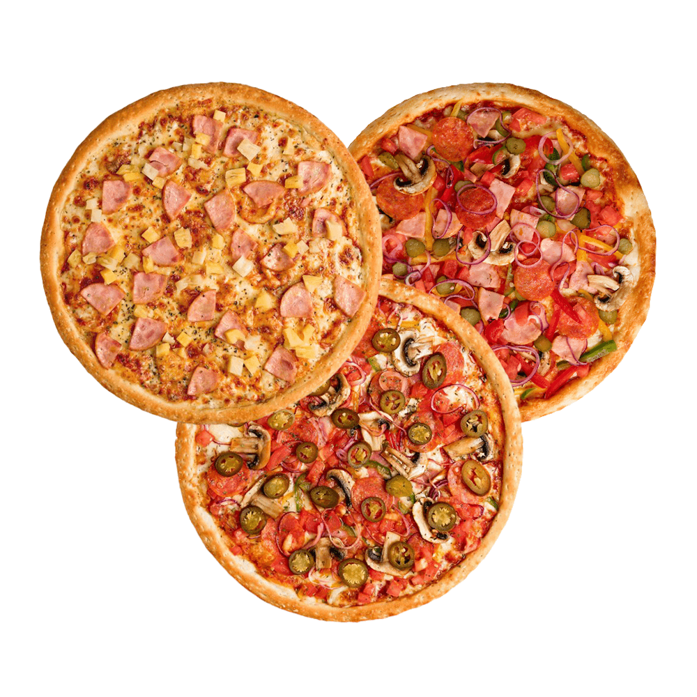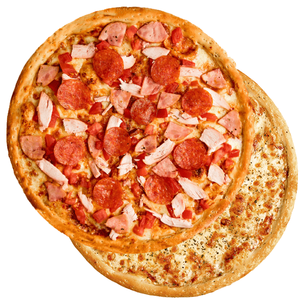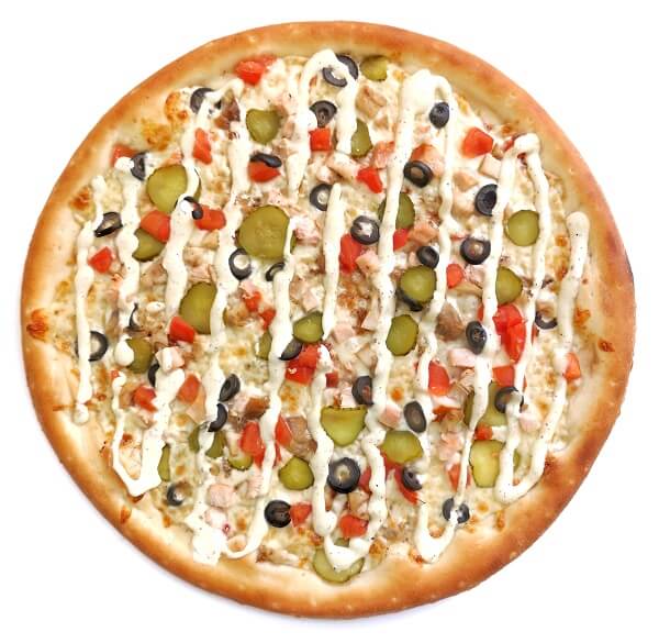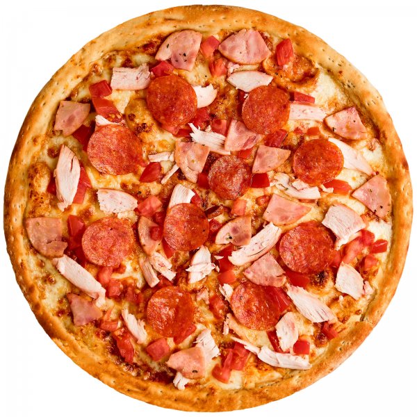 Тесто (мука, дрожжи сухие, сахар, соль, масло растительное, вода), сыр моцарелла, ветчина, пепперони, соус фирменный,курица копченая, перец болгарский, лук красный.