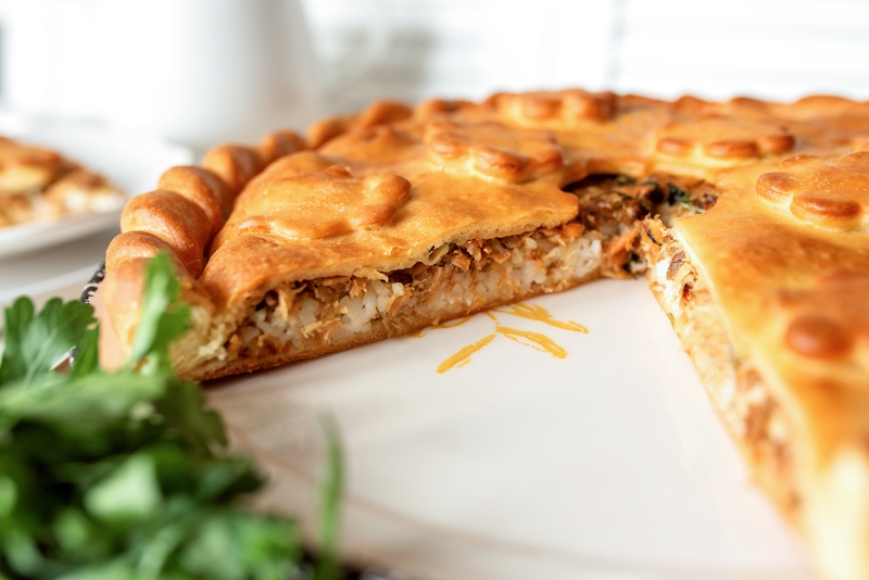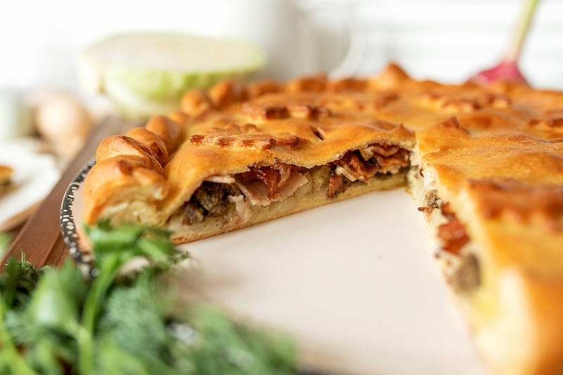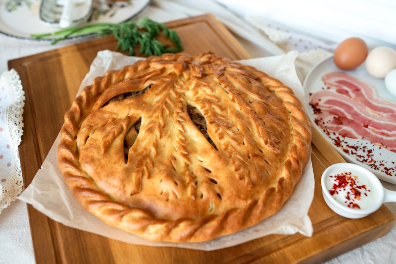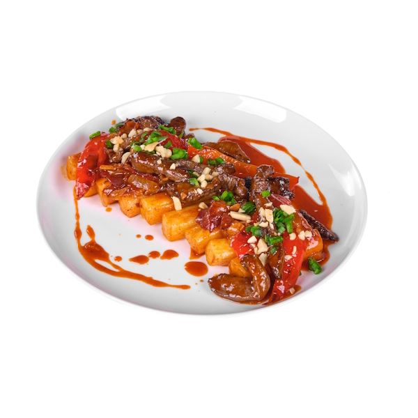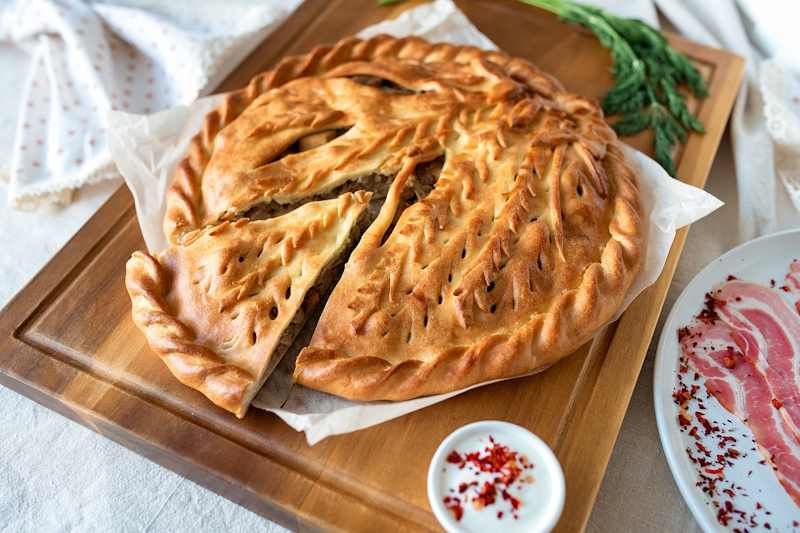 Начинистая и нежная кесадилья. В составе: сырная лепешка, сыр Гауда, цыплёнок су-вид, лук красный, перец болгарский запечённый, соус «Барбекю», соус фирменный «Пицца». Подаётся со сметаной.