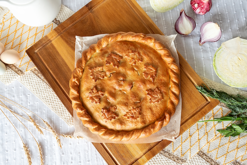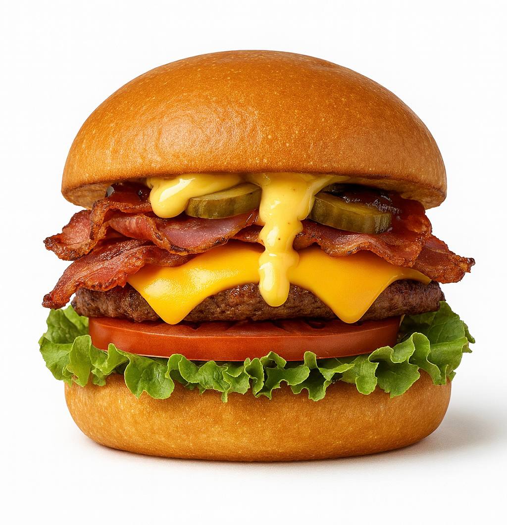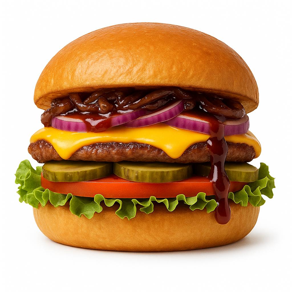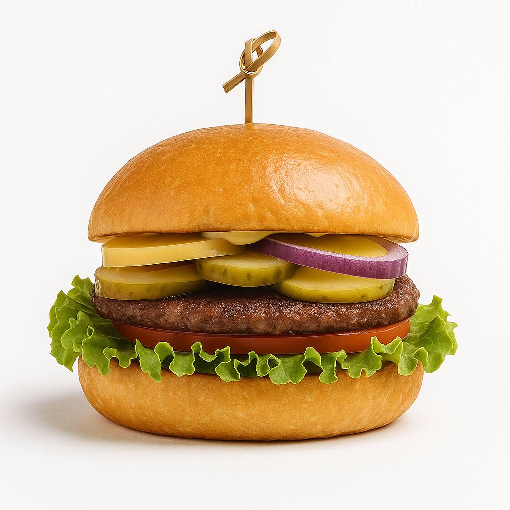 Тесто (мука, дрожжи сухие, сахар, соль, масло растительное, вода), сыр моцарелла, корнишоны, соус фирменный, пепперони, ветчина, перец болгарский, лук красный, шампиньоны, томаты