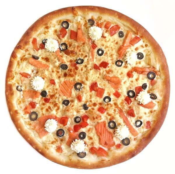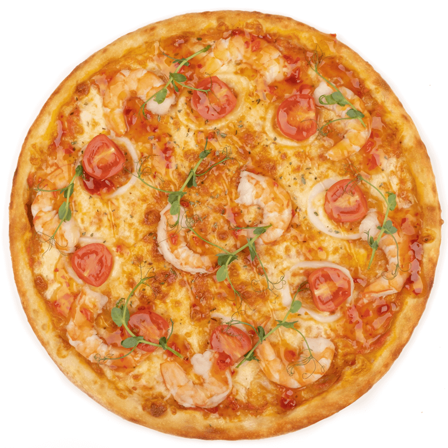 Пицца для ценителей вкусов Средиземноморья, свежайшие тигровые креветки, и филе кальмара, сладкие томаты Черри и фирменный томатный соус с перцем чипотле, под нежной и сливочной моцареллой