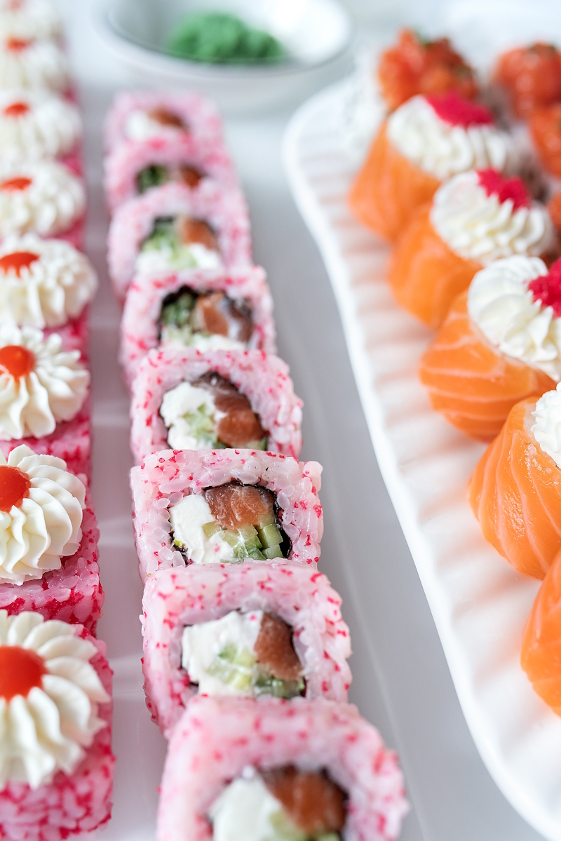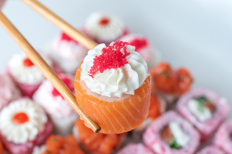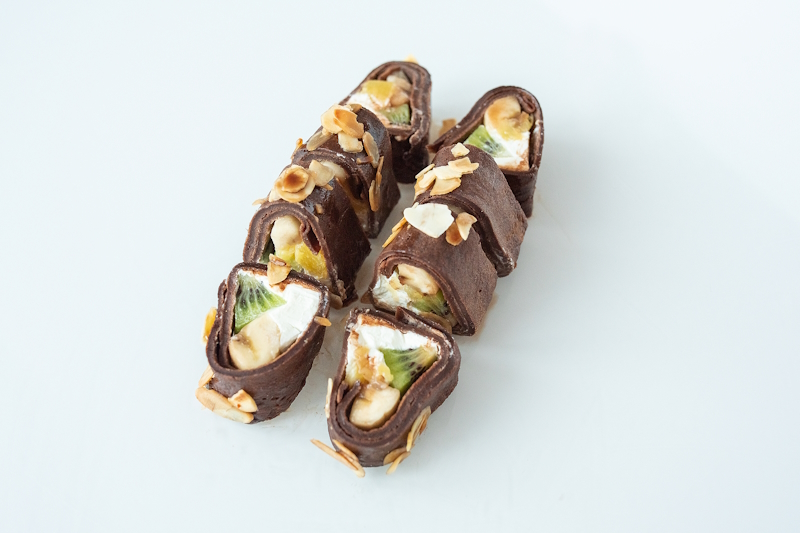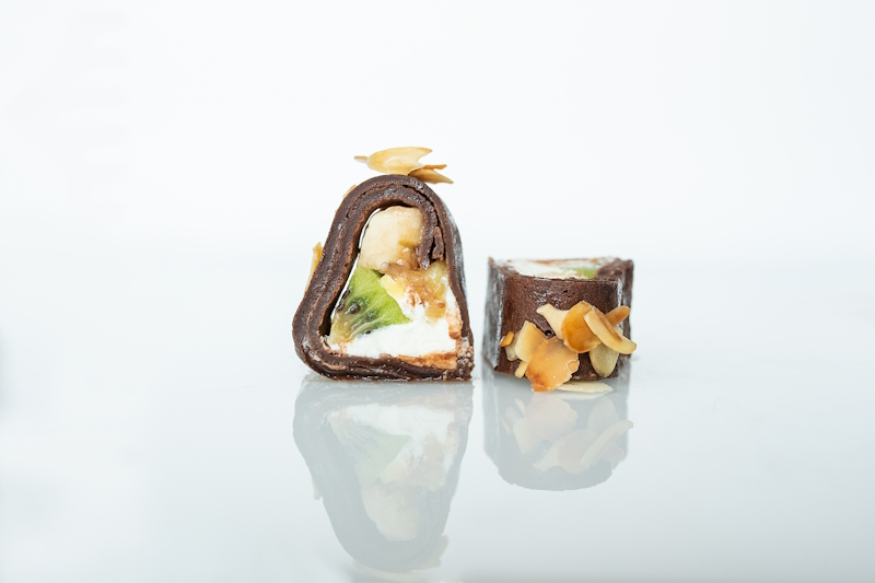 Сладкий ролл из шоколадного блина, сливочного сыра, ананаса, киви и банана, политый шоколадным топингом и посыпанный лепестками миндаля.