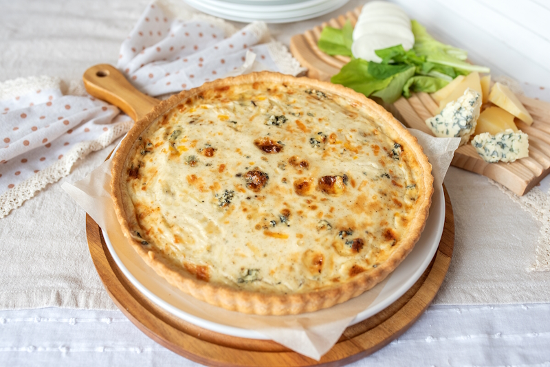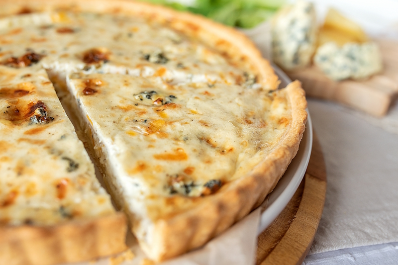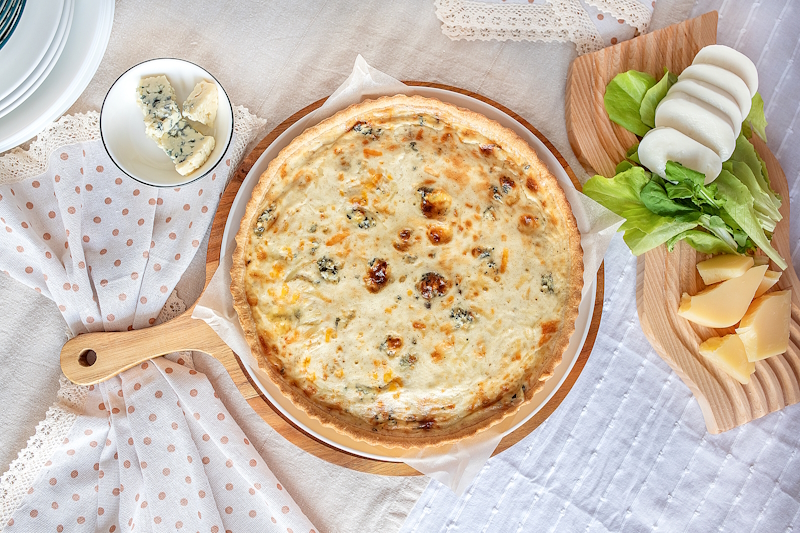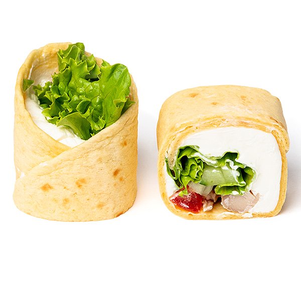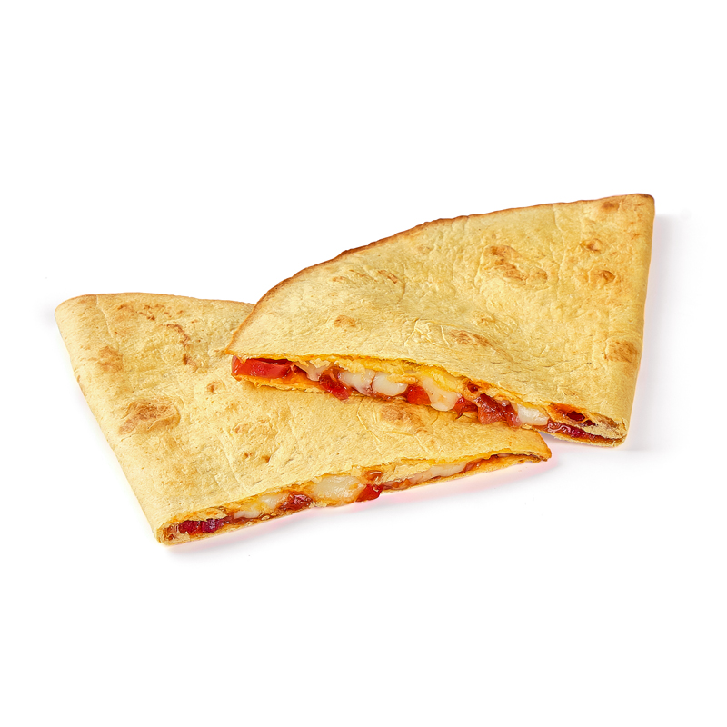 Тортилья сырная, сыр Моцарелла, цыпленок сувид (куриное филе, соус Хойсин, чеснок, соль), соус кесадилия (лук красный, перец болгарский красный, соус Барбекю, соус для пиццы фирменный), сметана 20%.