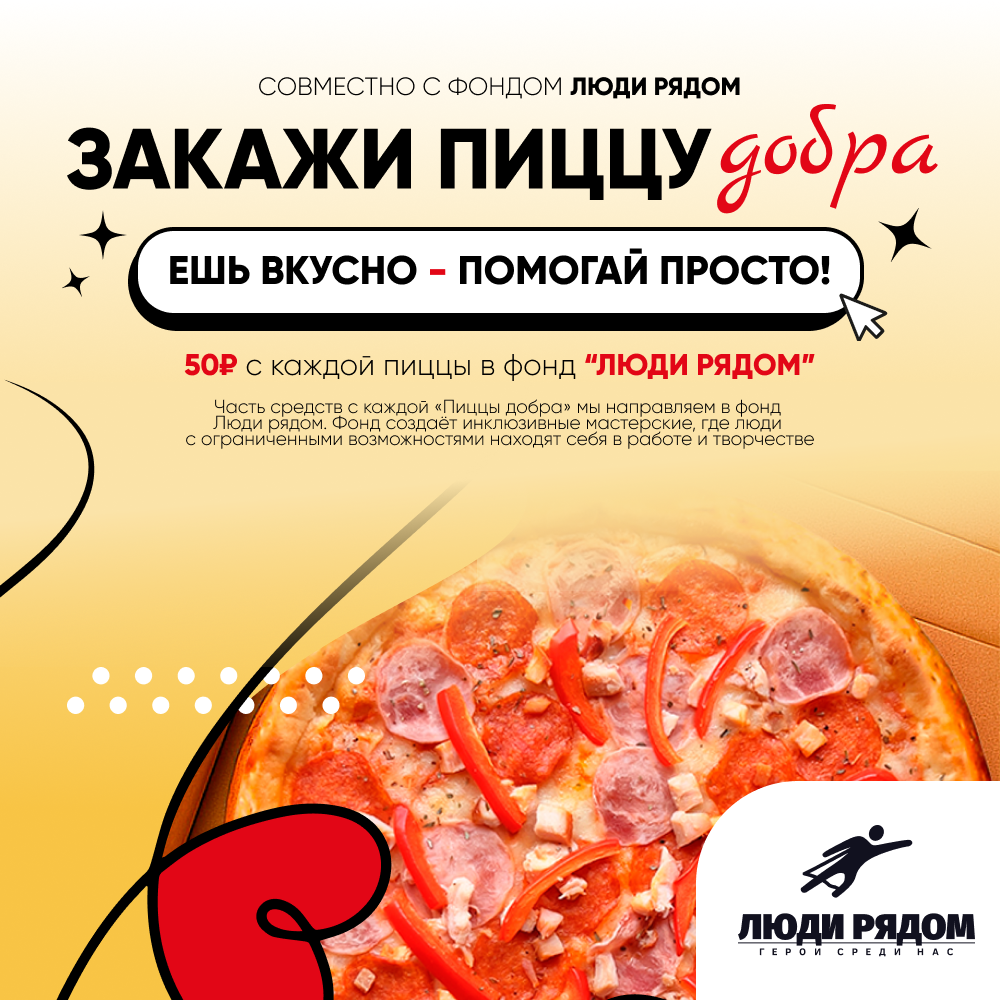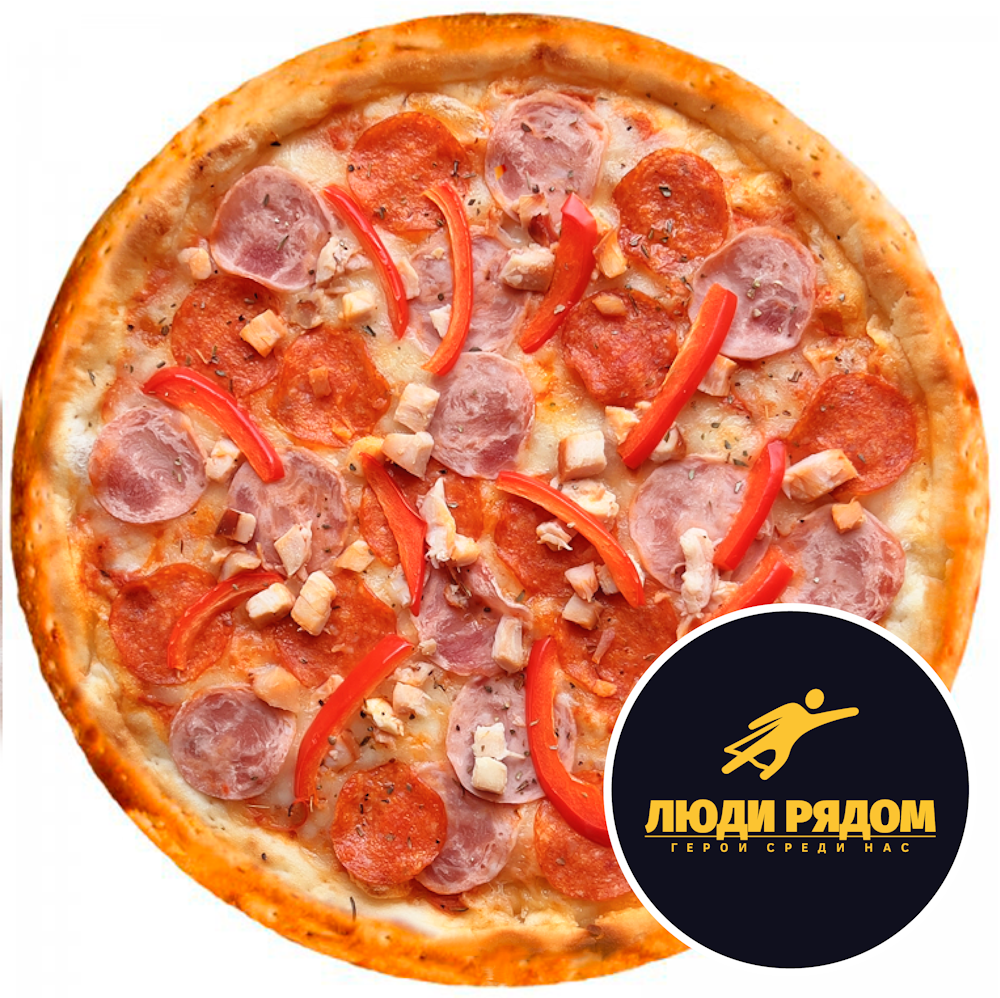 Совместно с фондом « Люди Рядом» запускаем пиццу добра! Сытная, с тремя видами мяса, насытит тело и дух, а 50р с каждой пиццы пойдет в фонд "Люди Рядом"