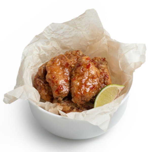 Крылья маринованные (крылья куриные, маринад соевый, имбирь сухой, чеснок сухой), кляр (мука, яйцо, крахмал картофельный, вода), соус-глазурь (смесь 5 перцев, чеснок, соус Сладкий Чили), лайм, тимьян.
