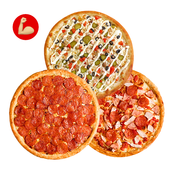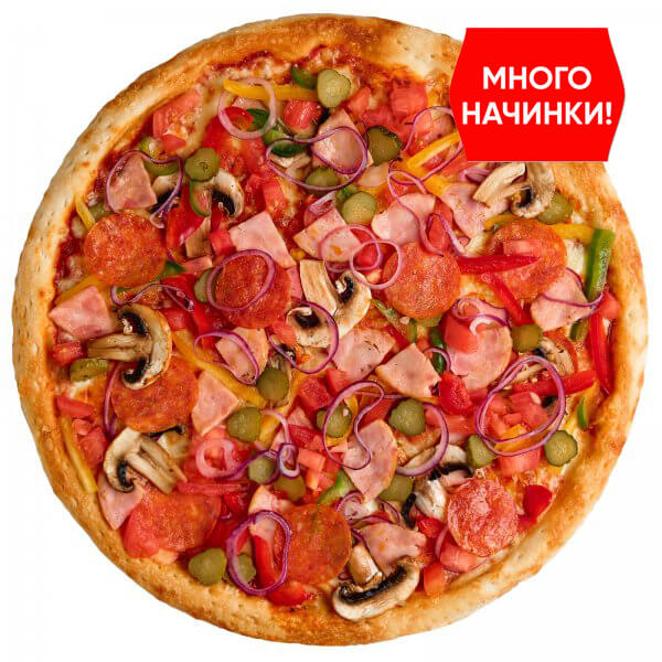 Пицца для тех, кто выбирает только лучшее! Вот смотрите: колбаски Пепперони, ветчина, томаты, шампиньоны и сыр Моцарелла делают основу пиццы. А сладкий перец, корнишоны, красный лук и фирменный соус уравновешивают вкус. Богатство ингредиентов создаст маленький вкусовой взрыв для особенно сочного вкуса =)