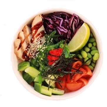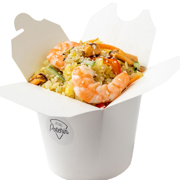 Бульон на Том Ям (вода, бульон куриный, сахар, имбирь свежий, соевый соус, паста Том Ям, шампиньоны, корень галангала, молоко кокосовое, лемонграсс св., лист лайма), томаты черри, перец чили, кальмар, осьминоги, креветка тигровая, лайм, лук зелёный, рис миксованный.