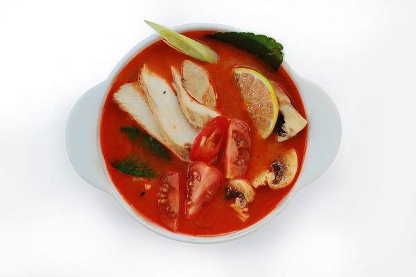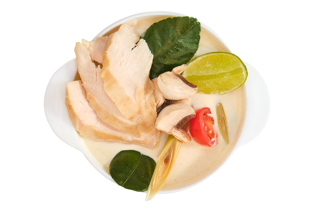 Кисло-острый суп с цыпленком су-вид, на кокосовом молоке. Набор тайских трав, корешков и специй – лемонграсса, листьев кафирного лайма, корня галангала, сока лайма, свежего чили, рыбного соуса,черри и грибов. Подается с рисом.