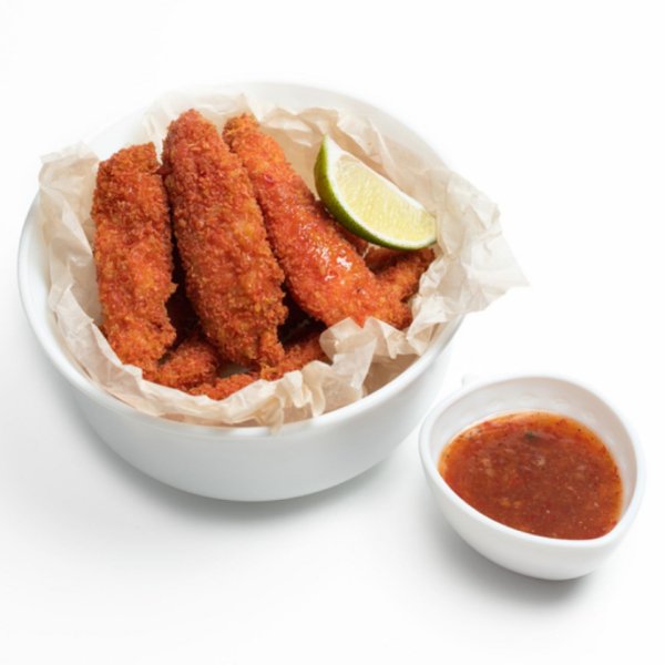 Куриное филе (соевый соус, маринад чеснок-травы), кляр (мука, яйцо, крахмал картофельный, вода), соус-глазурь (смесь 5 перцев, чеснок, соус Сладкий Чили), сухари Панко, лайм.
