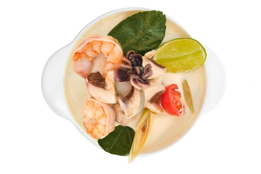 Кисло-острый суп с креветками, осьминожками и кальмаром на кокосовом молоке. Набор тайских трав, корешков и специй – лемонграсса, листьев кафирного лайма, корня галангала, сока лайма, свежего чили, рыбного соуса,черри и грибов. Подается с рисом.